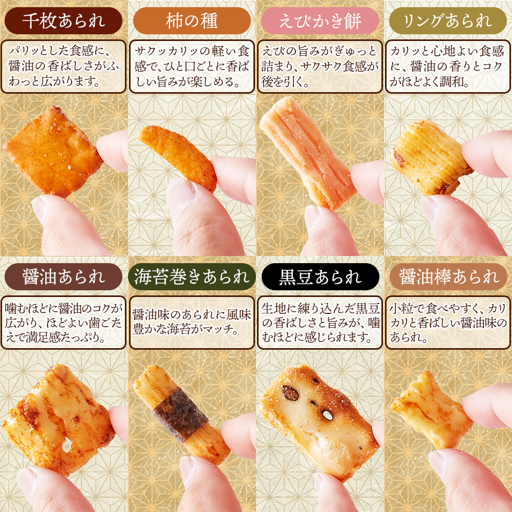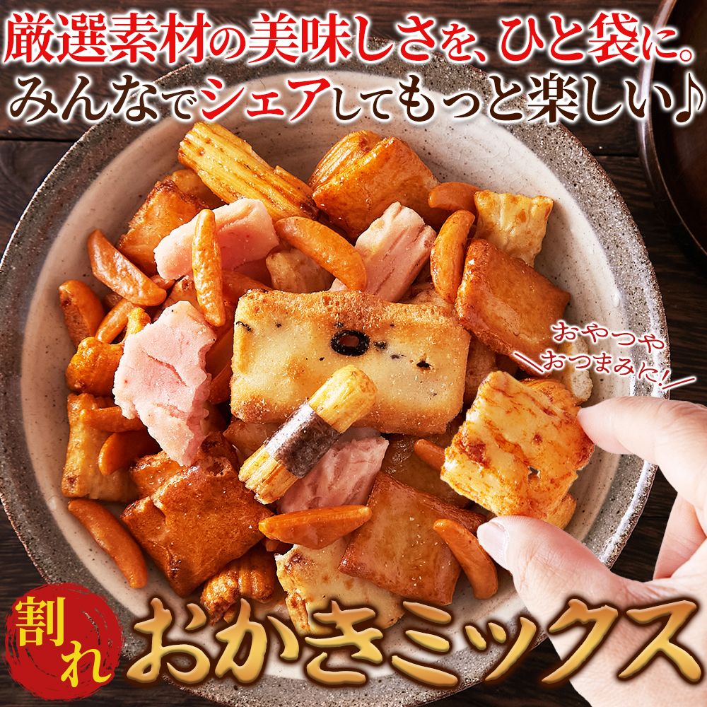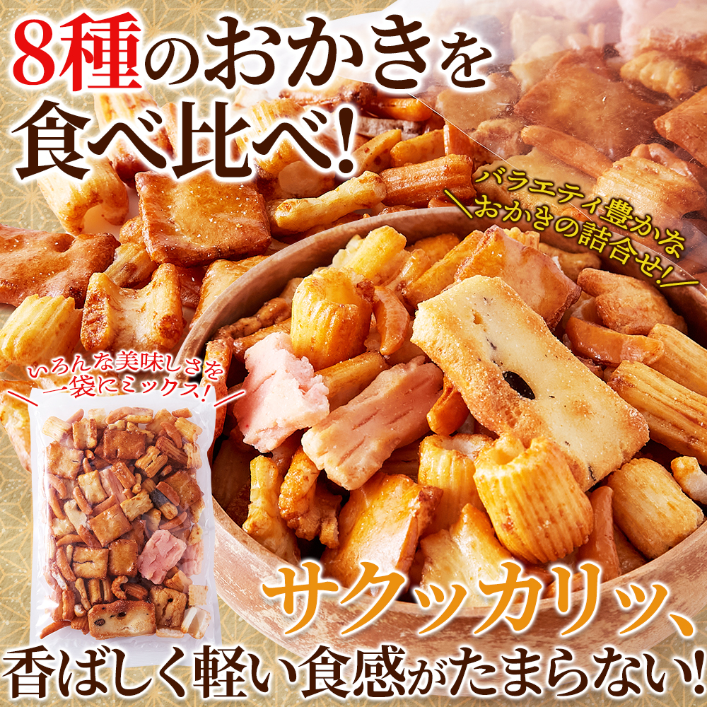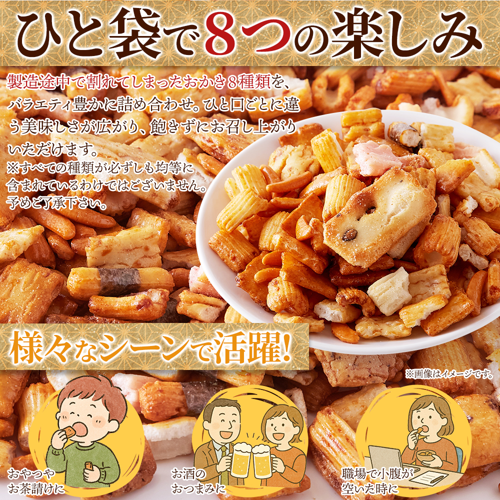 8種類のおかきを贅沢ミックス! 香ばしい醤油やえび風味など、食感も味わいも多彩。 おやつやおつまみにぴったりな割れおかき詰め合わせです。