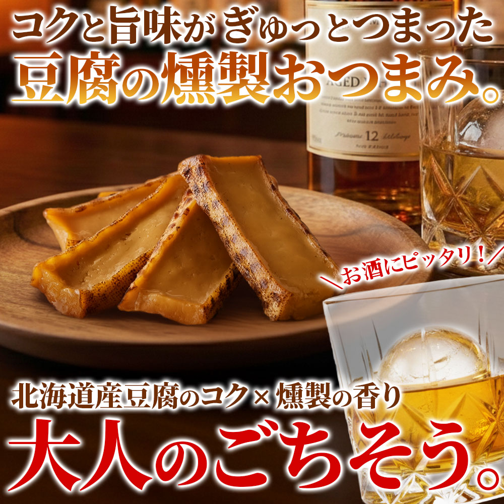北海道十勝産大豆の豆腐を使用した燻製おつまみ。 硬めの食感で、噛むほどに豆腐の旨みと桜チップの上品な香りが広がります。 常温保存・食べきりサイズでお酒のお供に最適。