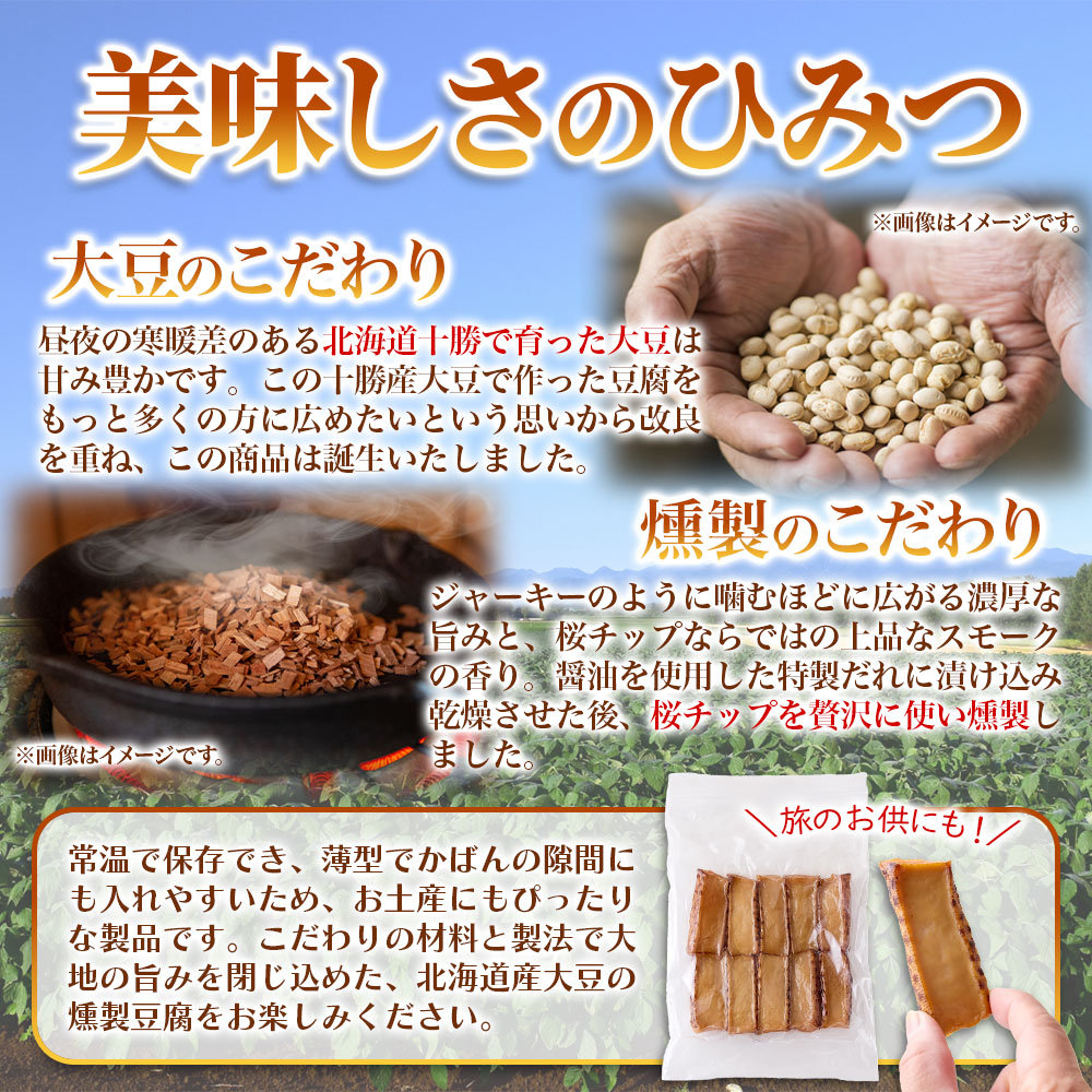 ①北海道十勝産の大豆で作った豆腐を燻製にした他に類似品がない珍しい商品。お酒にも合うおつまみ商品です。