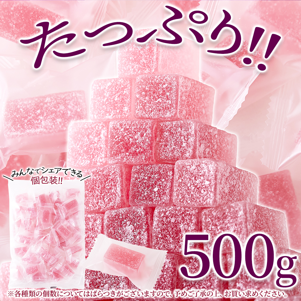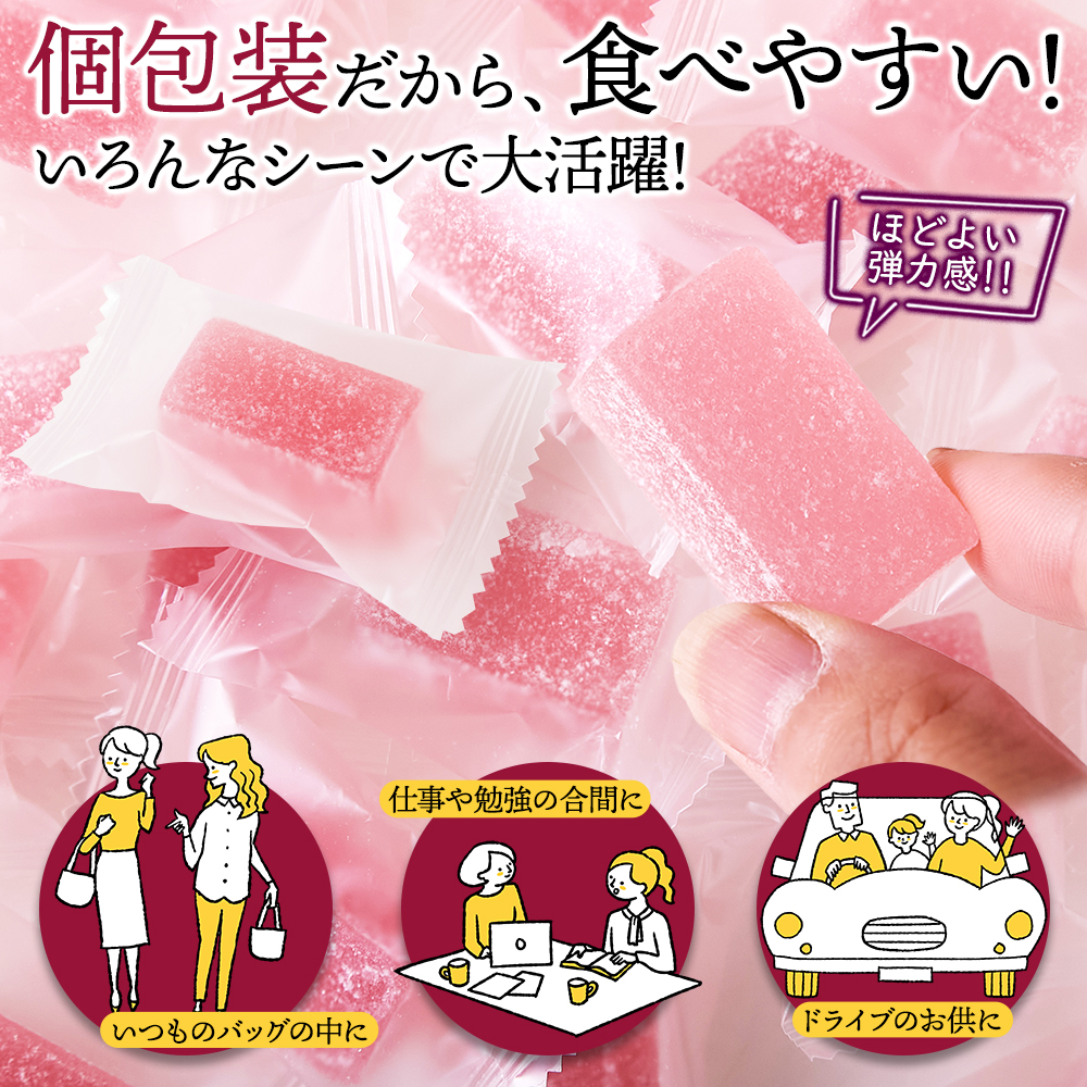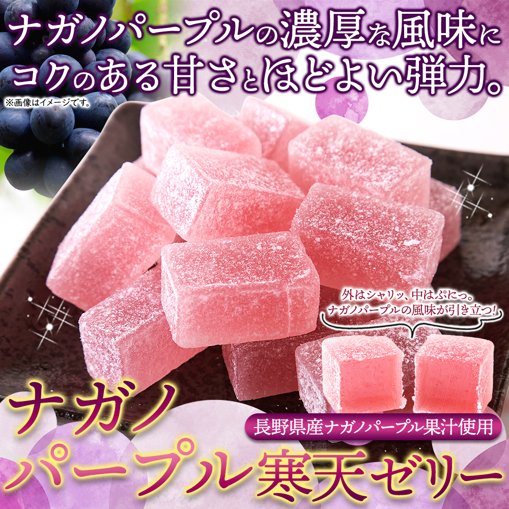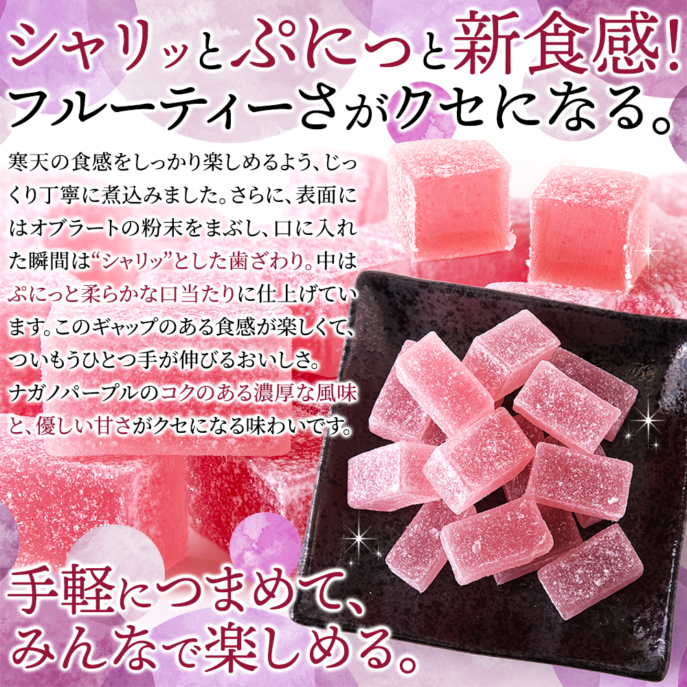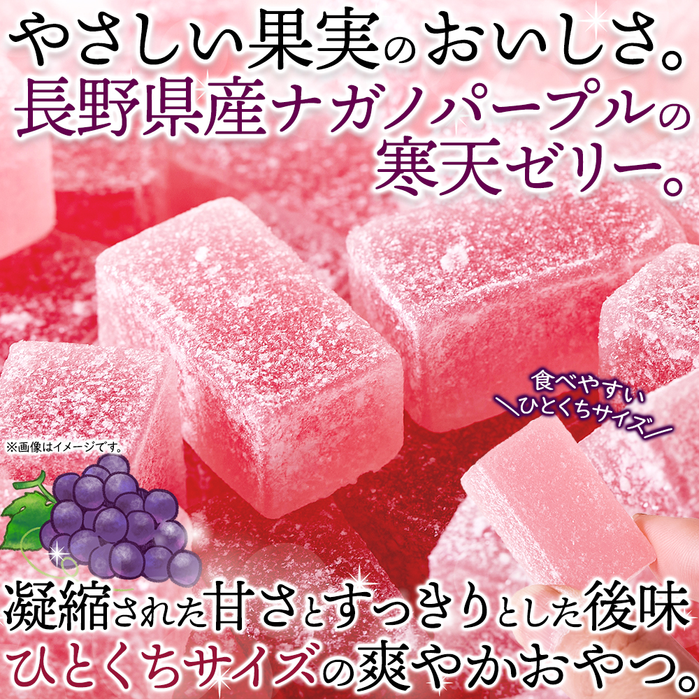 長野県産ナガノパープル果汁使用。 外はシャリッ、中はぷにっと! 濃厚な果実の甘みと寒天の弾力が楽しい、ひとくちサイズのフルーティーな寒天ゼリー。