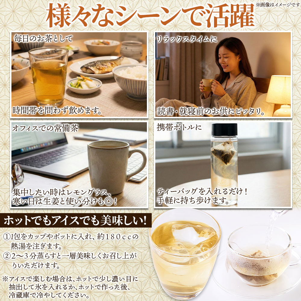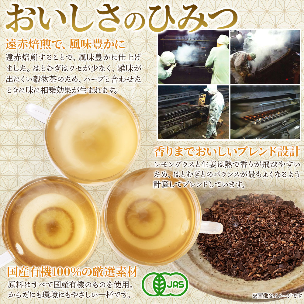国産有機素材100%使用。富山県産はとむぎを遠赤焙煎し、香ばしくやさしい味わいに仕上げました。プレーン・レモングラス・生姜の3種を楽しめるティーバッグアソート茶。