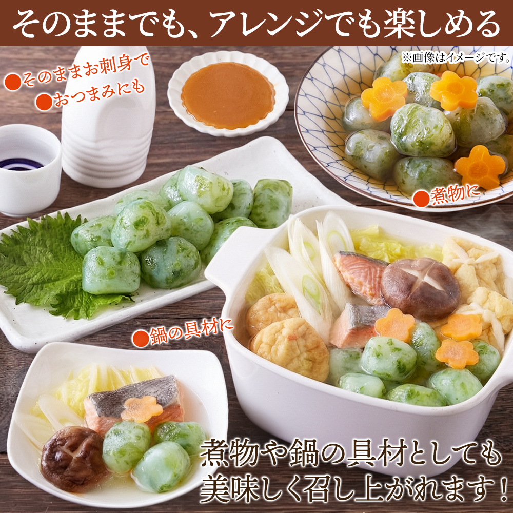 伊勢志摩あおのりをそのまま練りこんだ、風味豊かな玉こんにゃく!付属のからし酢みそで刺身こんにゃくとしても、お鍋の具にしても美味しい♪