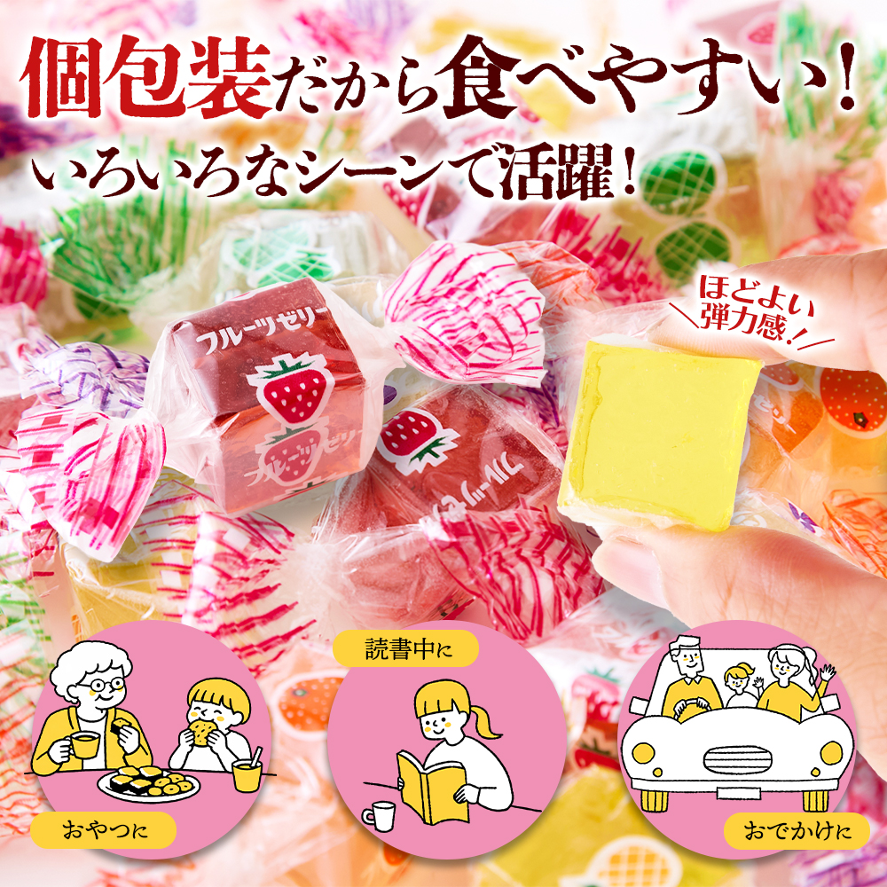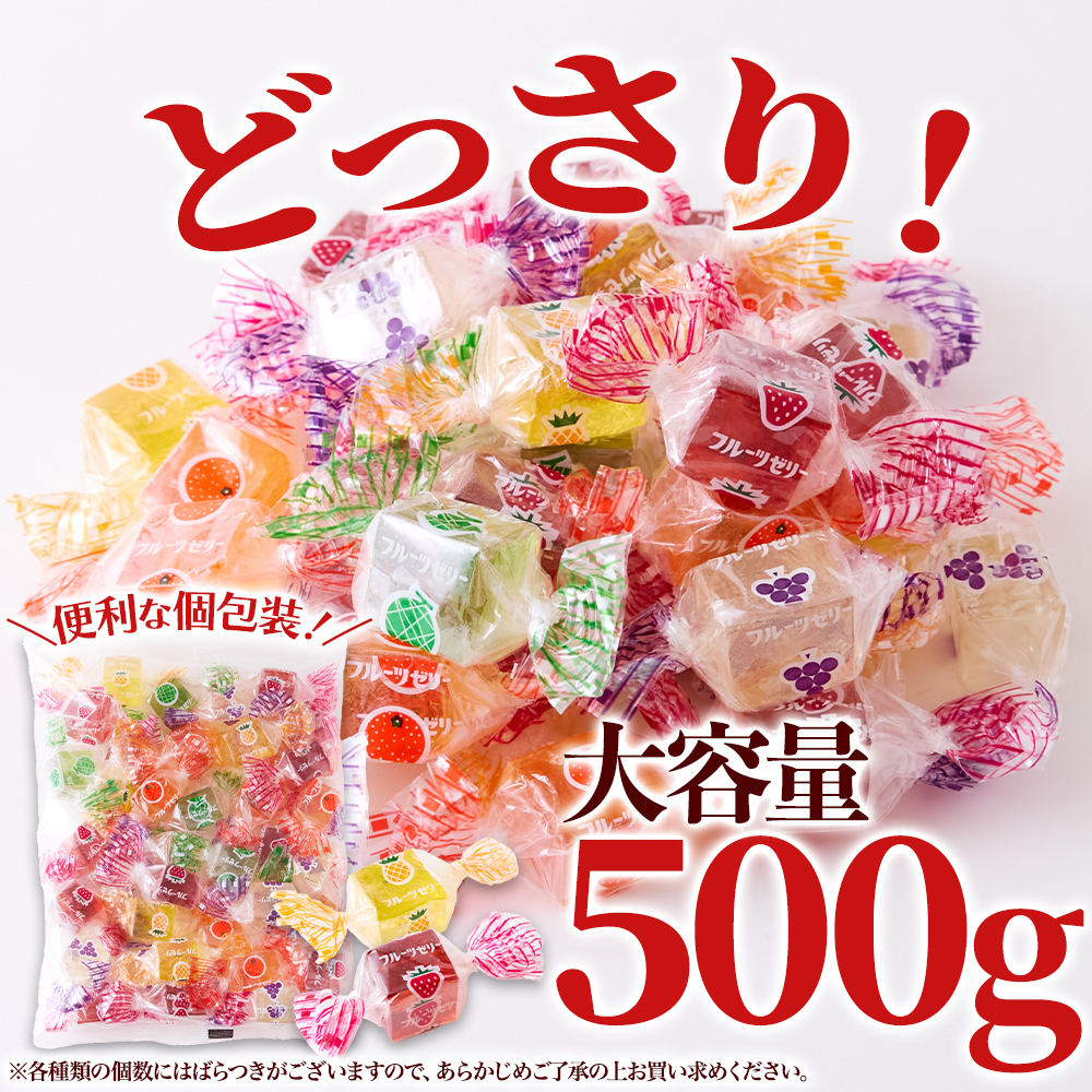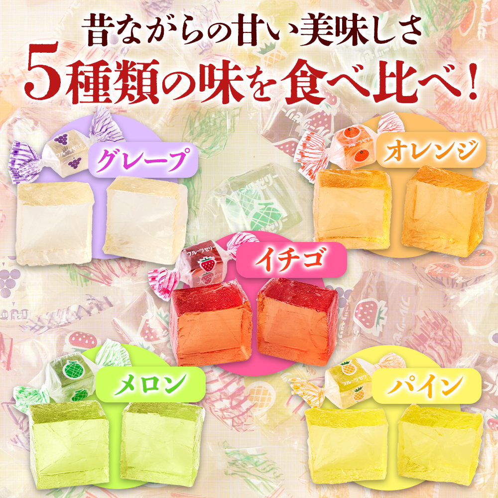 長年愛されるレトロなフルーツ風味の寒天ゼリーです。昔ながらのやさしい味わいと少し硬めの寒天の食感。食べやすいひとくちサイズで5種類の味を食べ比べできます。便利な個包装でいろいろなシーンで活躍。どっさり500gでお届けします!