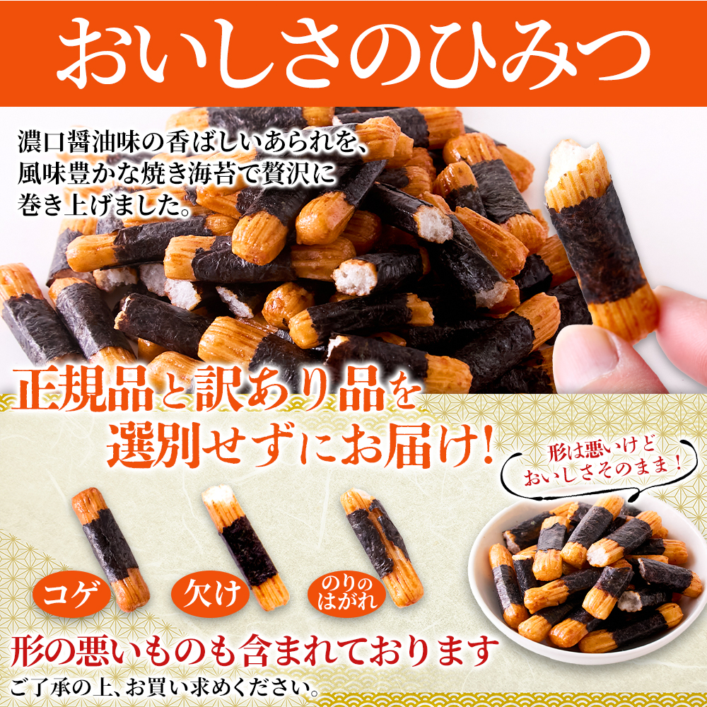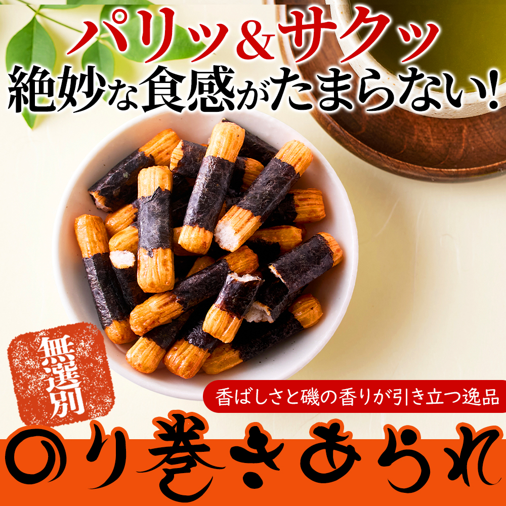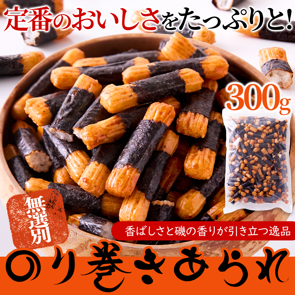 海苔とあられの最強コンビ!人気ののり巻きあられを無選別でたっぷり300g入りでお届けします♪