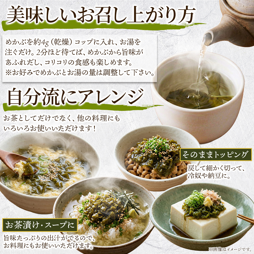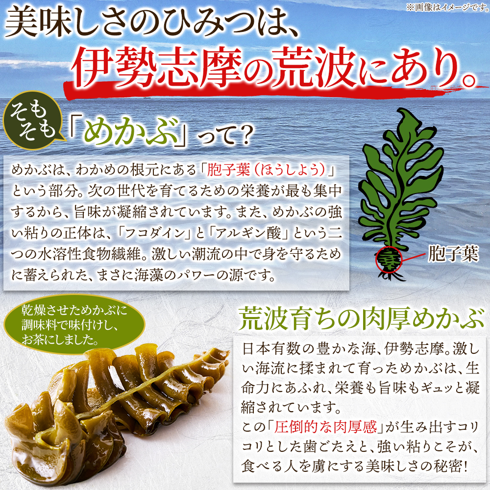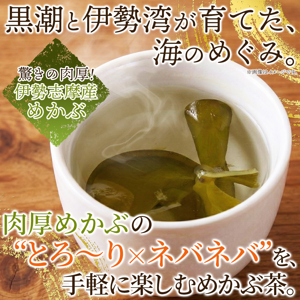 ②伊勢志摩産の肉厚で大株のめかぶは、お茶として楽しんだ後の食べ応えも抜群です。