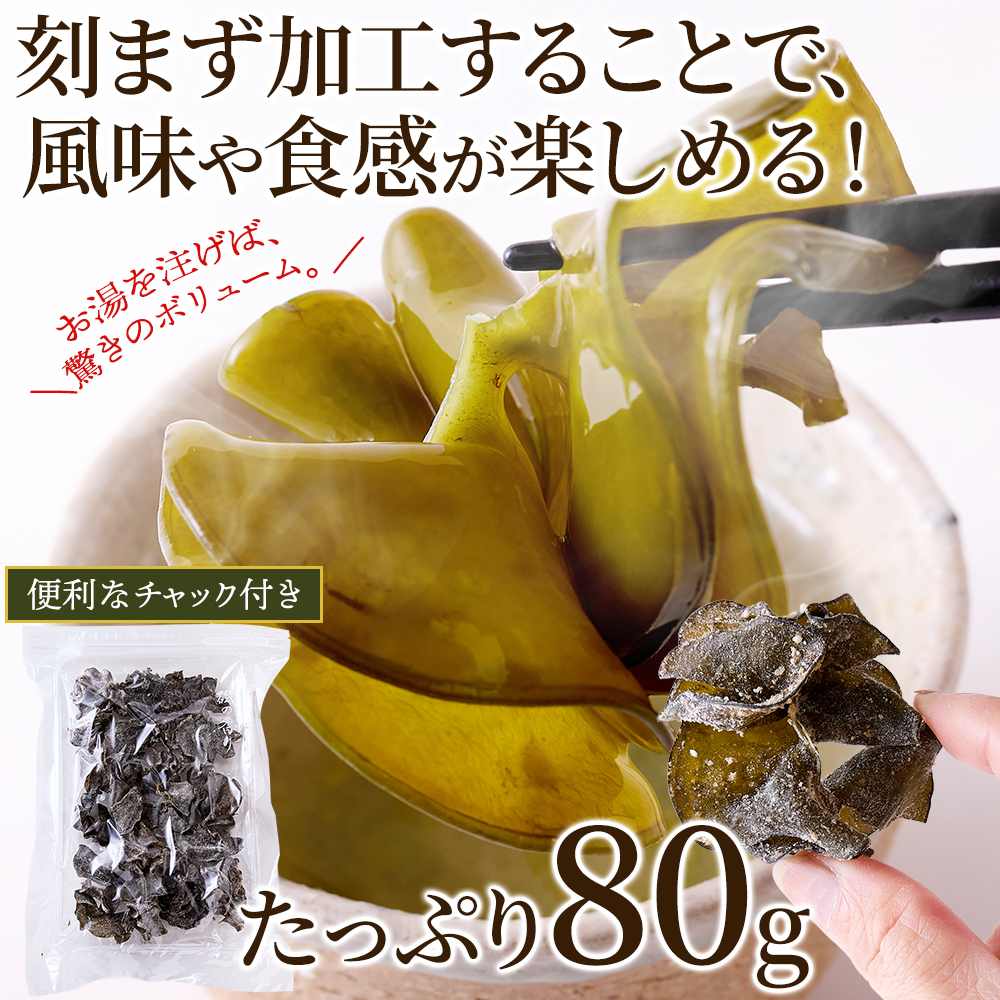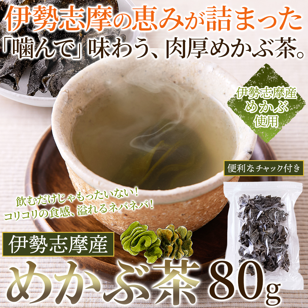 黒潮と伊勢湾が育てた肉厚な伊勢志摩産めかぶ茶。 乾燥させためかぶに調味料で味付けし、お茶にしました。 お湯を注ぐと旨味があふれだし、コリコリの食感も楽しめます。 便利なチャック付き。たっぷり80gでお届け!