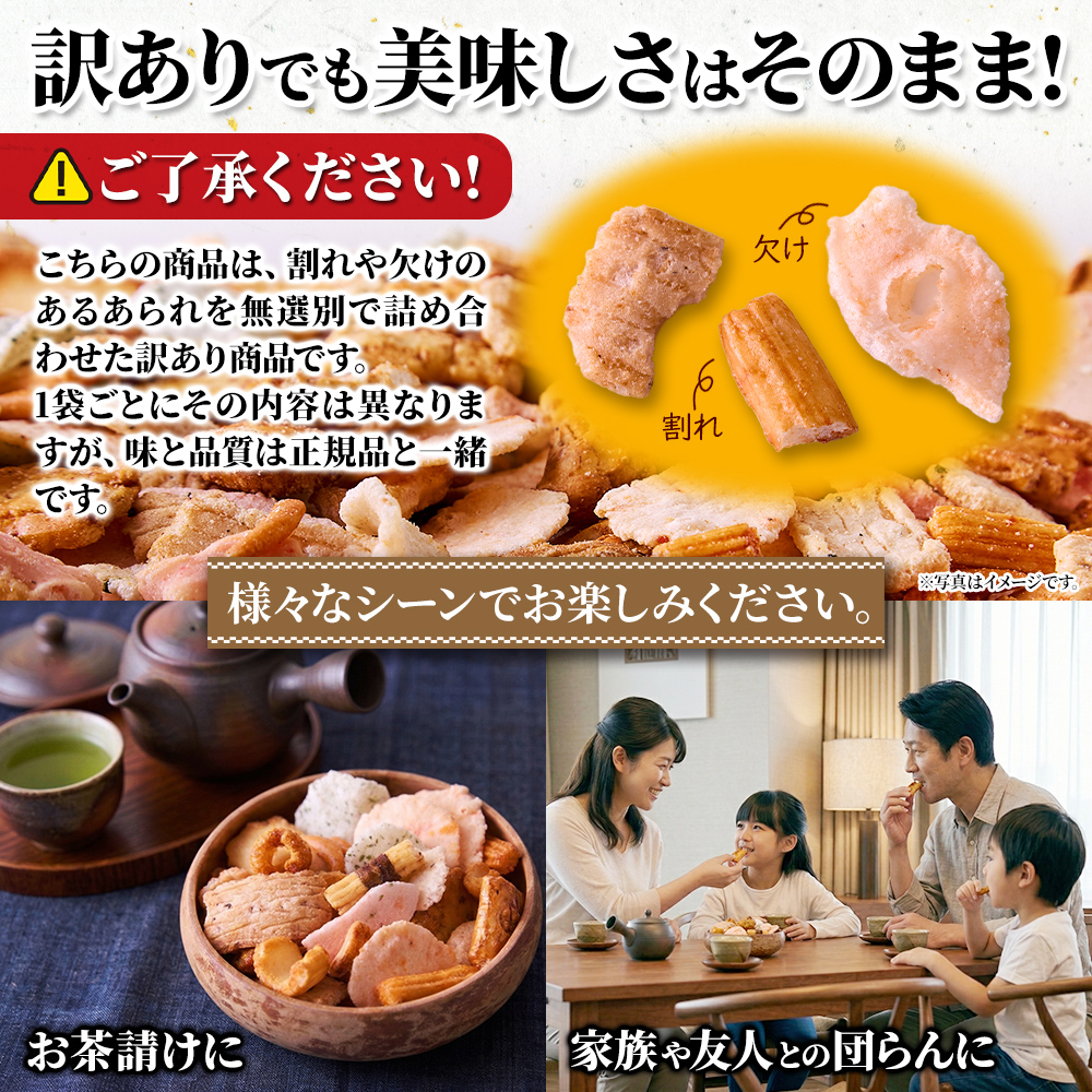 割れや欠けのあるものも含め、バラエティ豊かなあられやおかきを詰め込みました♪保存に便利なチャック付き袋でお届け!!